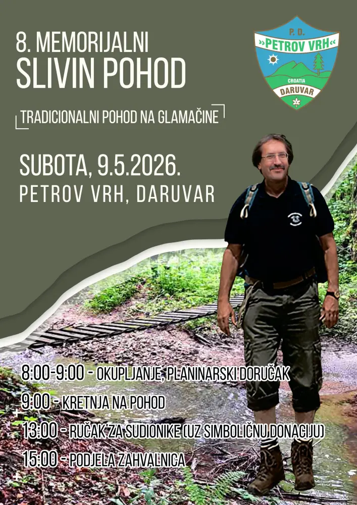 pozivamo Vas na 8. Slivin pohod koji će se održati 09.05.2026. s početkom u 9 sati kod planinarskog doma Petrov vrh.