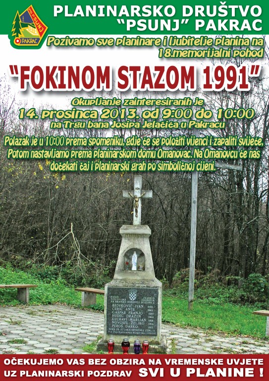 Naše planinarsko društvo 14. prosinca 2013. godine organizira tradicionalni memorijalni planinarski pohod FOKINOM STAZOM 1991. Pohod se održava u znak sjećanja na pogibije naših branitelja – IVANA BEDEKOVIĆA, ANTU ĆURIĆA, FRANJU GAŠPARA, MARIJANA KULHAVOG FOKU, DRAŽENA HUDECA, ŽELJKA NOVOSELA I DARKA PEROŠA.