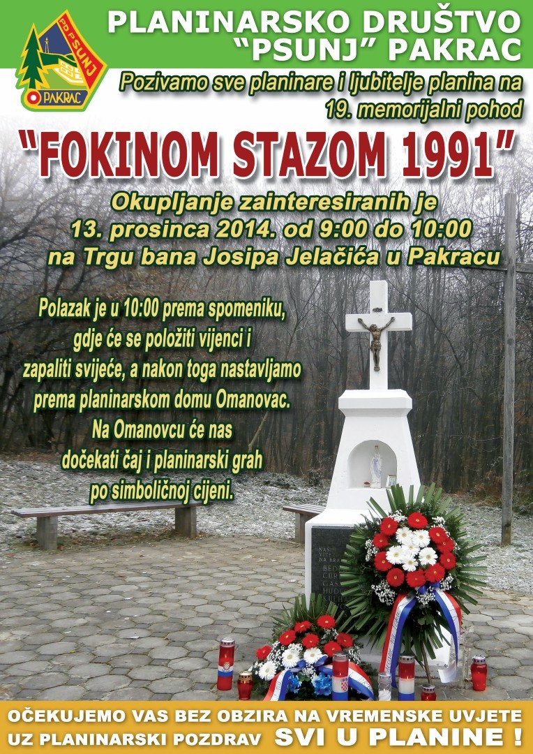 Naš tradicionalni memorijalni planinarski pohod FOKINOM STAZOM 1991., organiziramo 13. prosinca 2014. godine. Pohod se održava u znak sjećanja na pogibije naših branitelja – IVANA BEDEKOVIĆA, ANTU ĆURIĆA, FRANJU GAŠPARA, MARIJANA KULHAVOG FOKU, DRAŽENA HUDECA, ŽELJKA NOVOSELA I DARKA PEROŠA.
