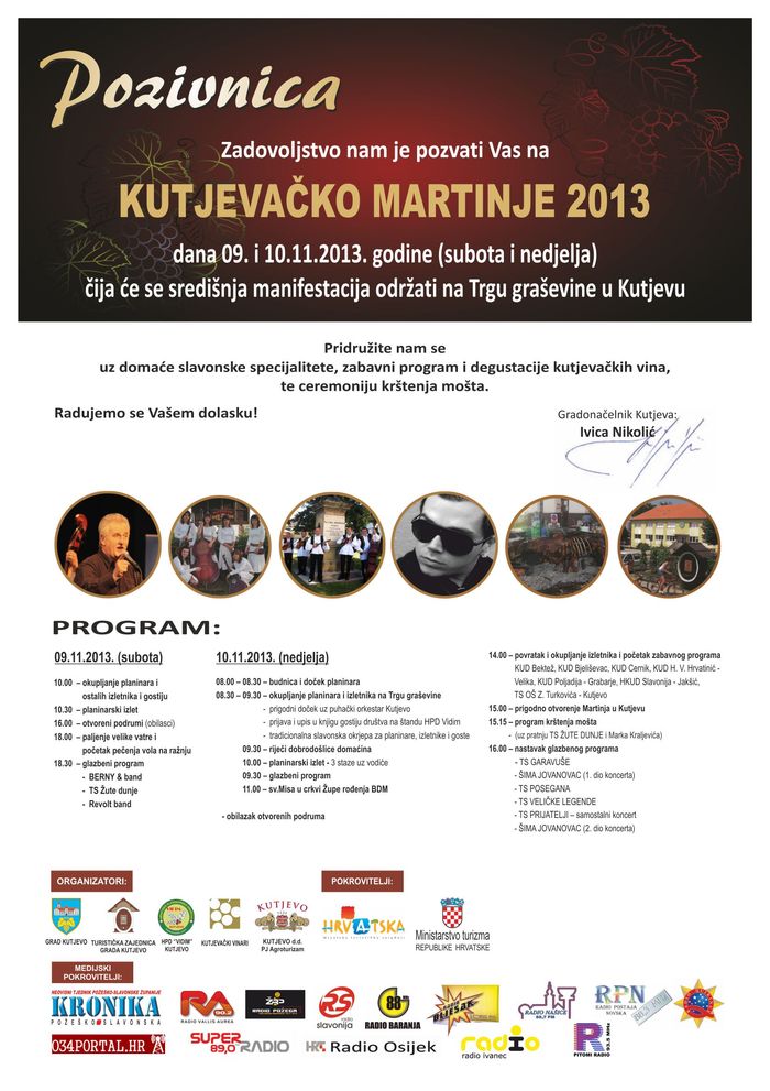 Grad Kutjevo, TZ grada Kutjeva, HPD “Vidim” Kutjevo, Kutjevački vinari i Kutjevo d.d. PK Agroturizam pozivaju Vas u dane 09. i 10. studenog 2013. godine (subota i nedjelja) u prigodi Sv. Martina na 16. tradicionalni izlet za planinare, izletnike i sve ljubitelje vrhunske kutjevačke vinske kapljice na Kutjevačko Martinje 2013.