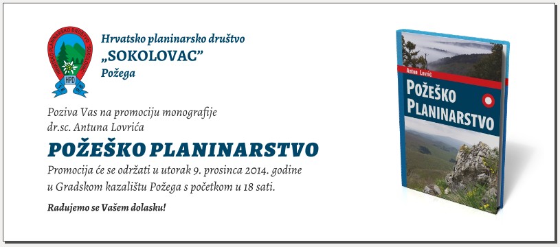 U utorak, 09. prosinca 2014., Hrvatsko planinarsko društvo Sokolovac Požega organizira predstavljanje monografije “Požeško planinarstvo” svog dugogodišnjeg člana i predsjednika u više mandata dr.sc. Antuna Lovrića.