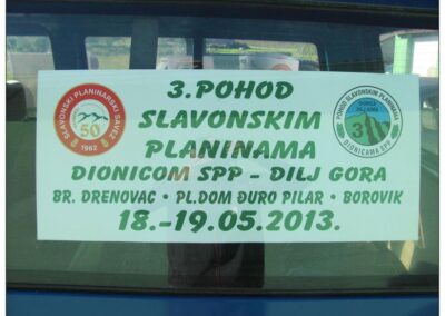 18. i 19.05.2013. održan je „3. Pohod slavonskim planinama – dionica Dilj gora“ u dužini od 72 kilometra. Prvi dan se hodalo od Brodskog Drenovca preko Lovčića, Grgurevića i planinarske kuće „Pljuskara“ do planinarskog doma „Đuro Pilar“. To je etapa od 36 km. Slijedeći dan čekalo nas je daljnjih 36 kilometara do Borovika preko jezera Ljeskovac, Čardaka, nadstrešnice „Spektar“ i odmora na Vučjim glavama kod skretanja za Paučje.